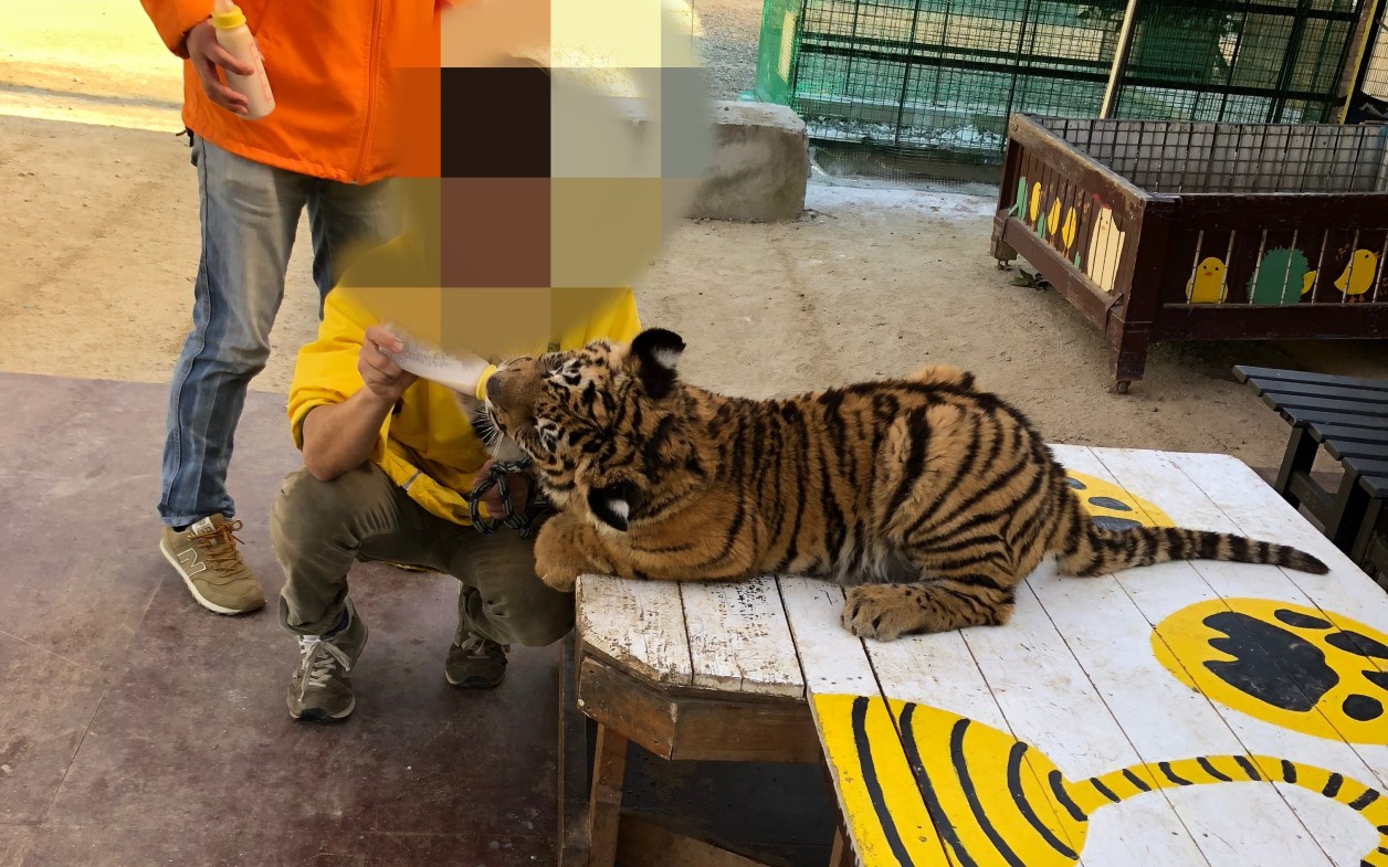 (飼育員さんがトラの赤ちゃんにミルクを飲ませている隣に座っての撮影)や